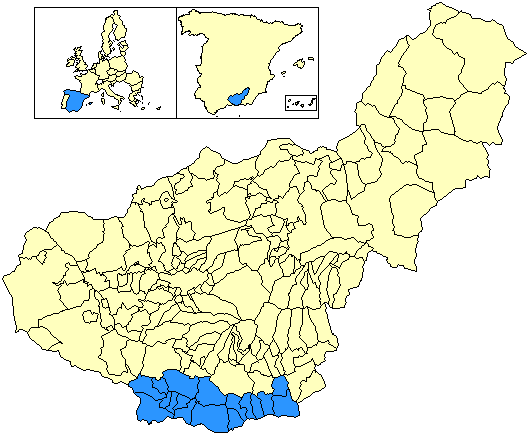The Granada Coast or Costa Tropical is a Spanish region located in the southern end of the province of Granada. This territory borders to the east with the Poniente Almeriense region, in Almería; to the west with Axarquía – Costa del Sol, in Málaga; to the north with Alhama, the Lecrín Valley and the Alpujarra Granadina; and to the south it has access to the Mediterranean Sea.